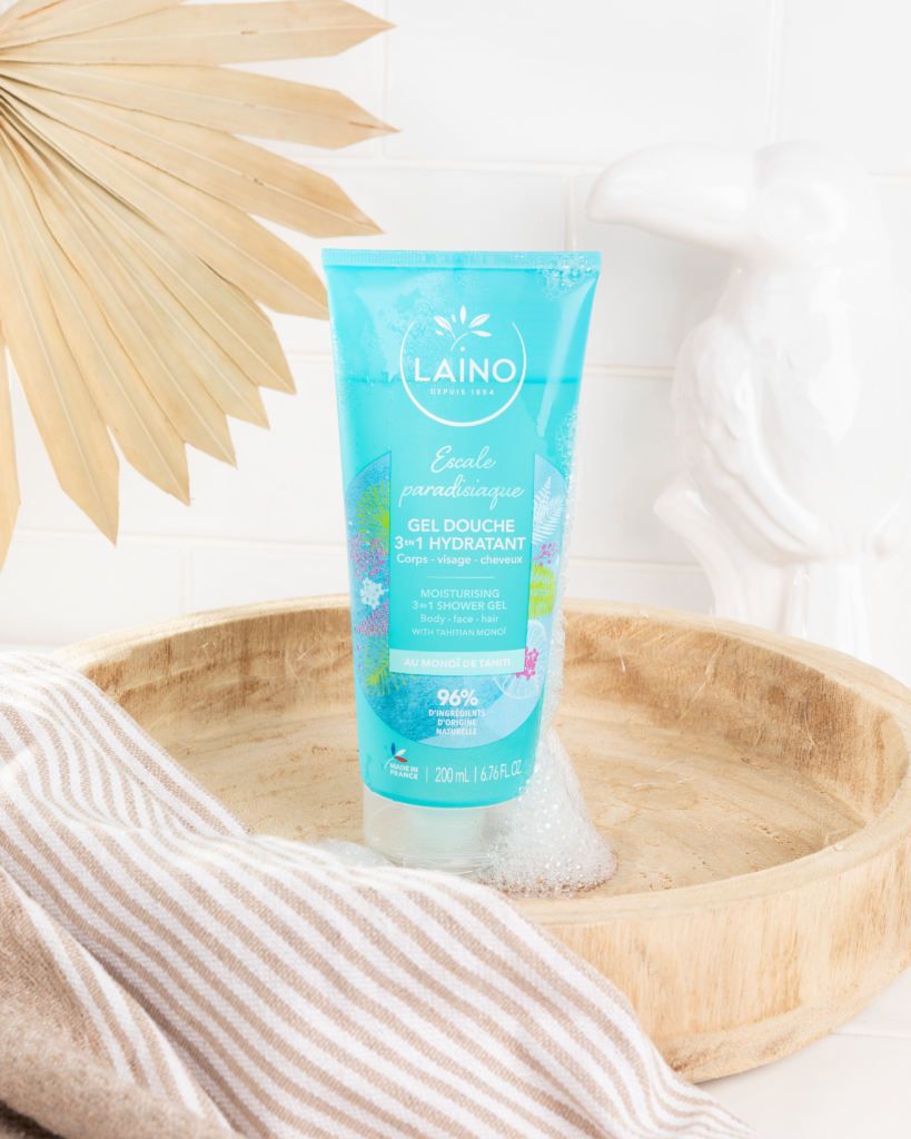 Ce gel douche 3 en 1 vous offre une texture ultra fondante qui nettoie délicatement la peau et les cheveux et les parfume de notes ensoleillées de fleur de tiaré et de jasmin.