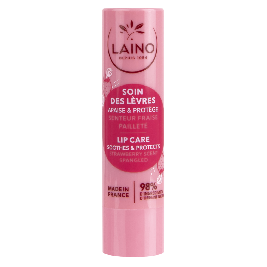 Ce soin des lèvres Laino à la texture fondante qui pare vos lèvres fragilisées d’un soin pailleté à la senteur fraise.